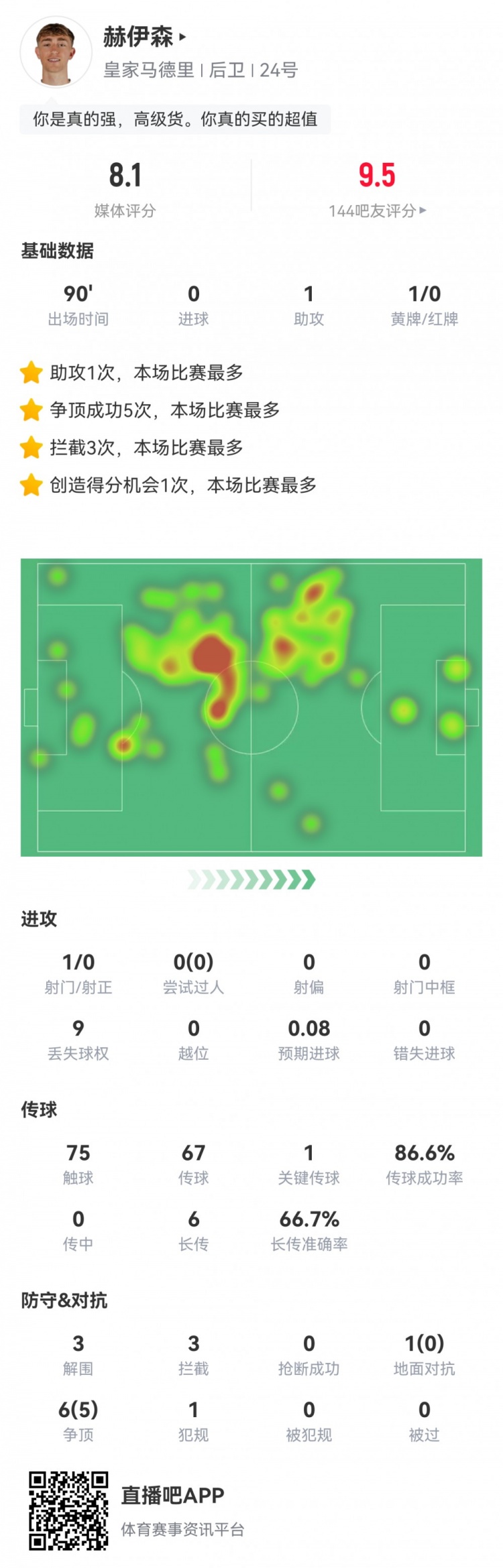 8月31日西甲第三轮,皇家马德里以2-1战胜马洛卡。本场比赛中,赫伊森作为首发球员打满全场,其关键数据如下: