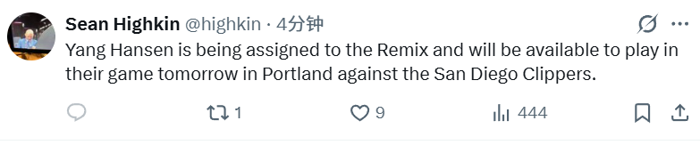 北京时间12月4日,据开拓者队记Sean Highkin报道,杨瀚森被开拓者下放到发展联盟下属的混音队,将可以出战明日混音对阵圣迭戈快船的比赛。